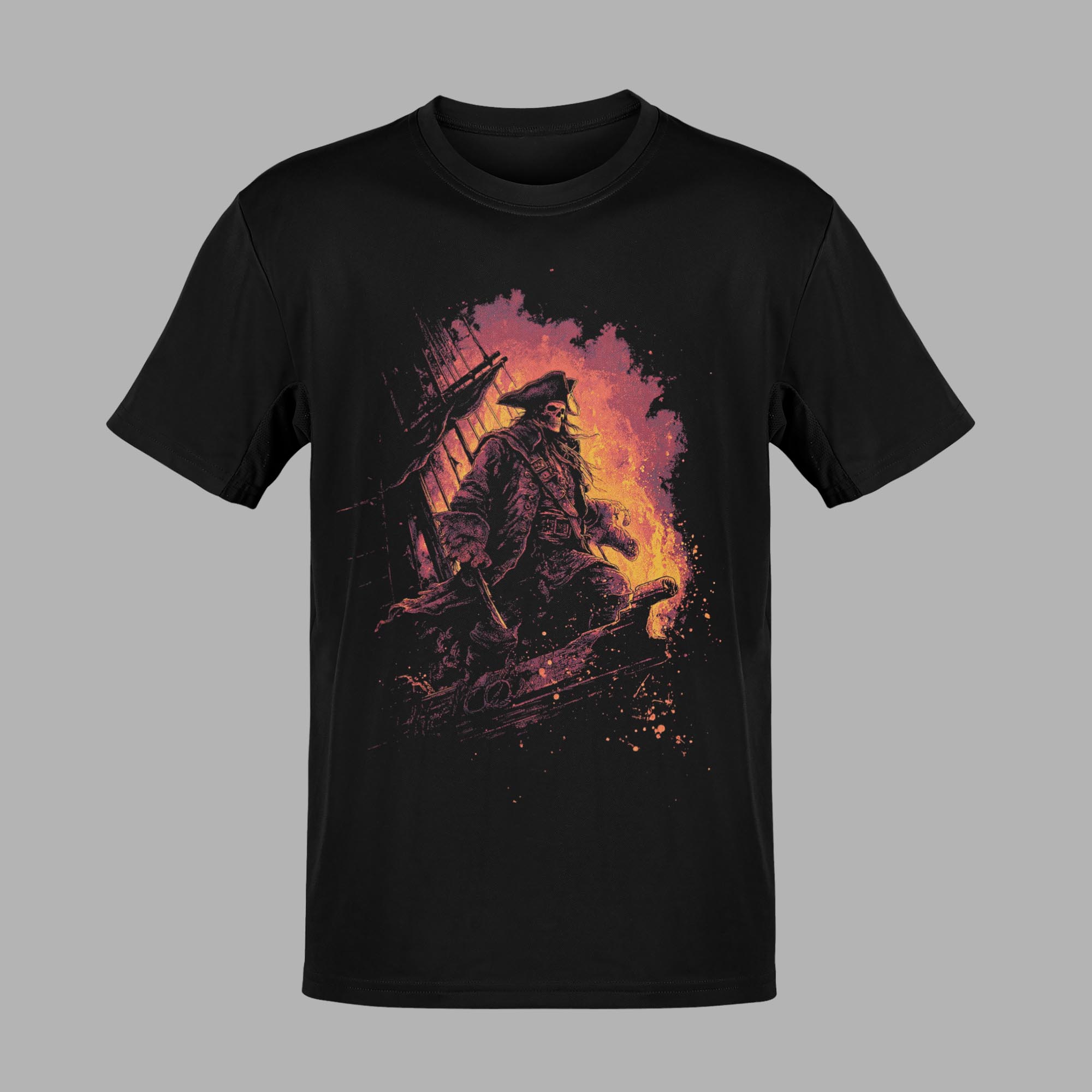 Bold pirate captain t-shirt energy: a skeletal captain rising from a burning deck, framed by crackling flames and splintered wood.