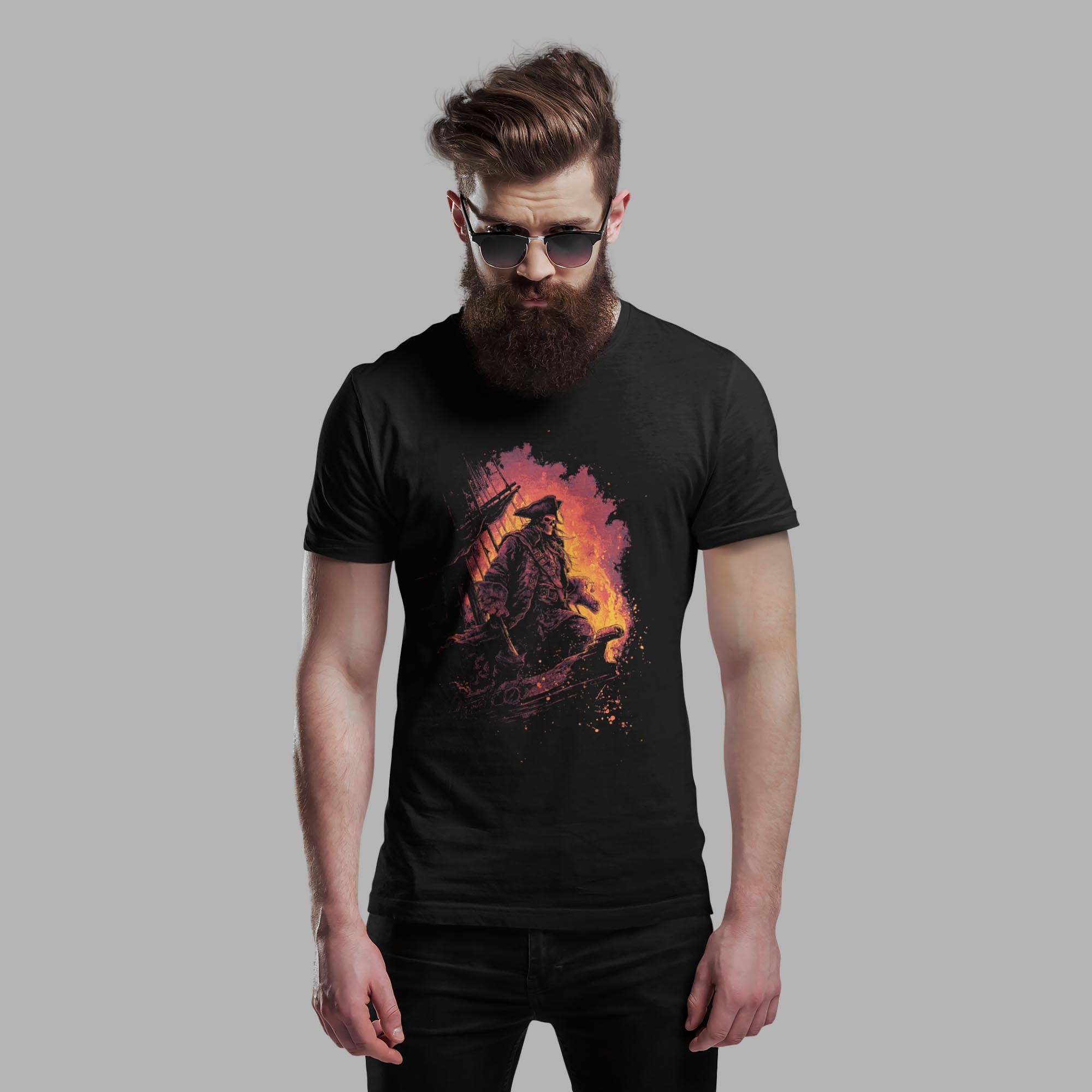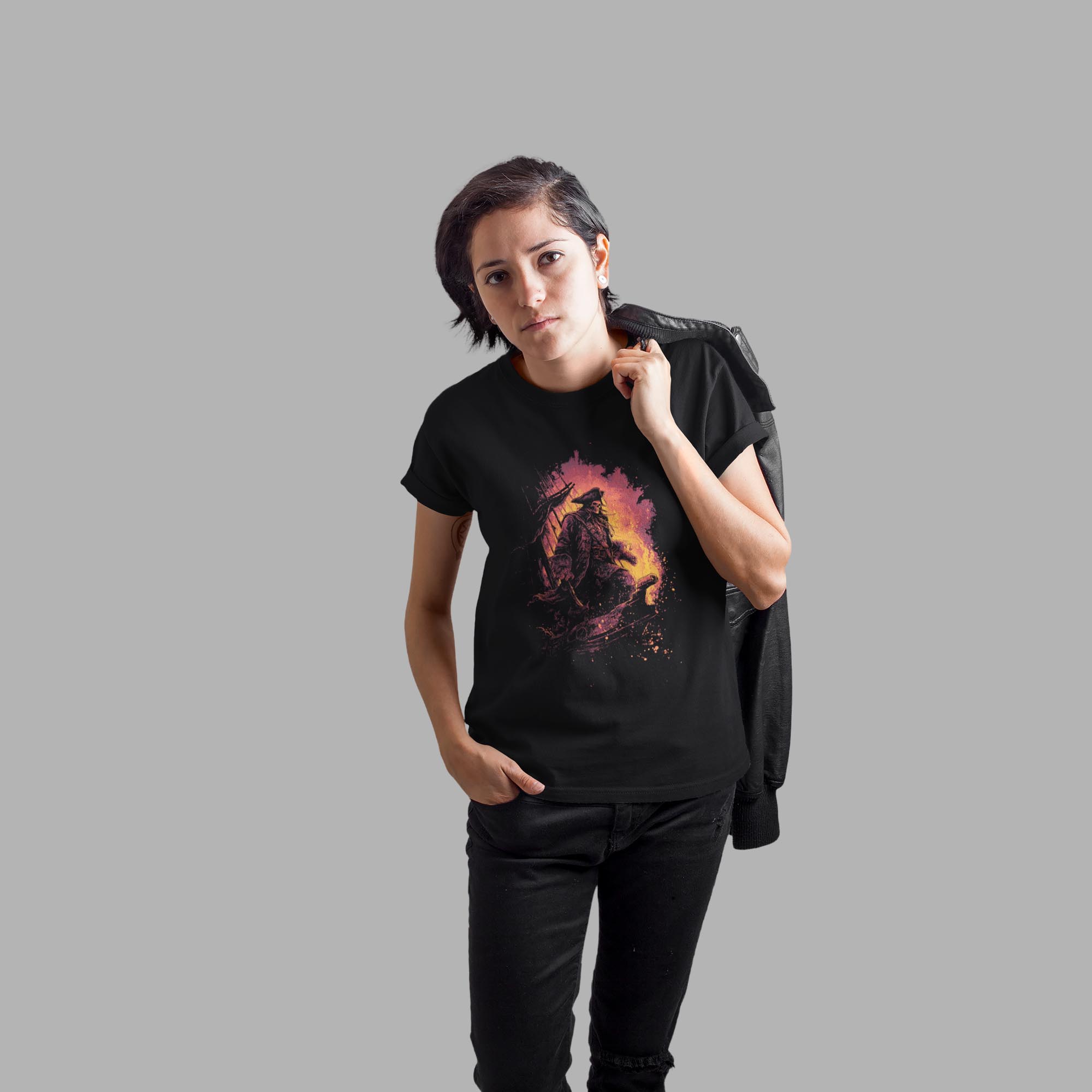 Because of the high-contrast fire against the deep black tee, this dark pirate streetwear graphic hits hard. Meanwhile, the hand-drawn linework keeps the artwork detailed without feeling muddy.
