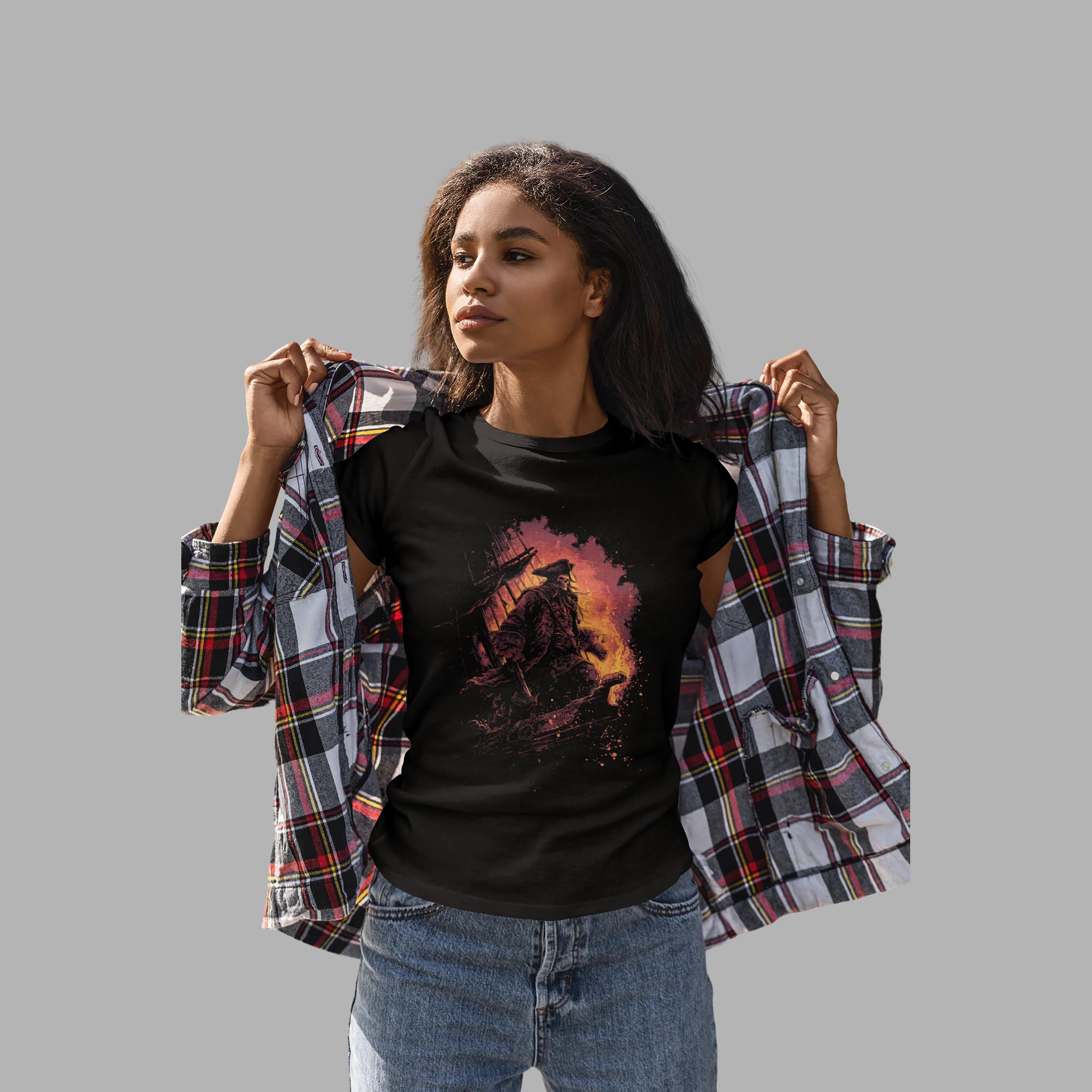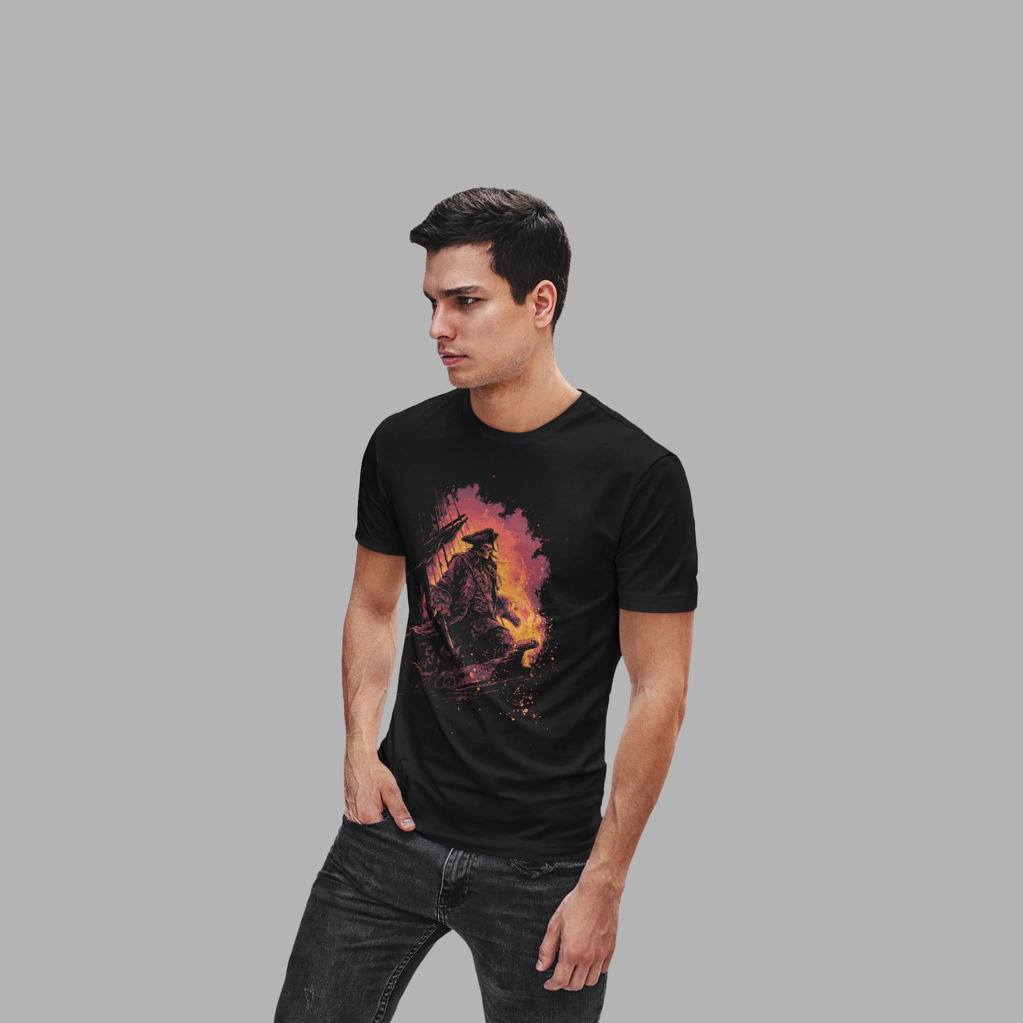 Ashwake Captain is all fire and folklore. This pirate captain t-shirt shows a skeletal captain standing at the bow of his ship, swallowed by orange flame and drifting ash.