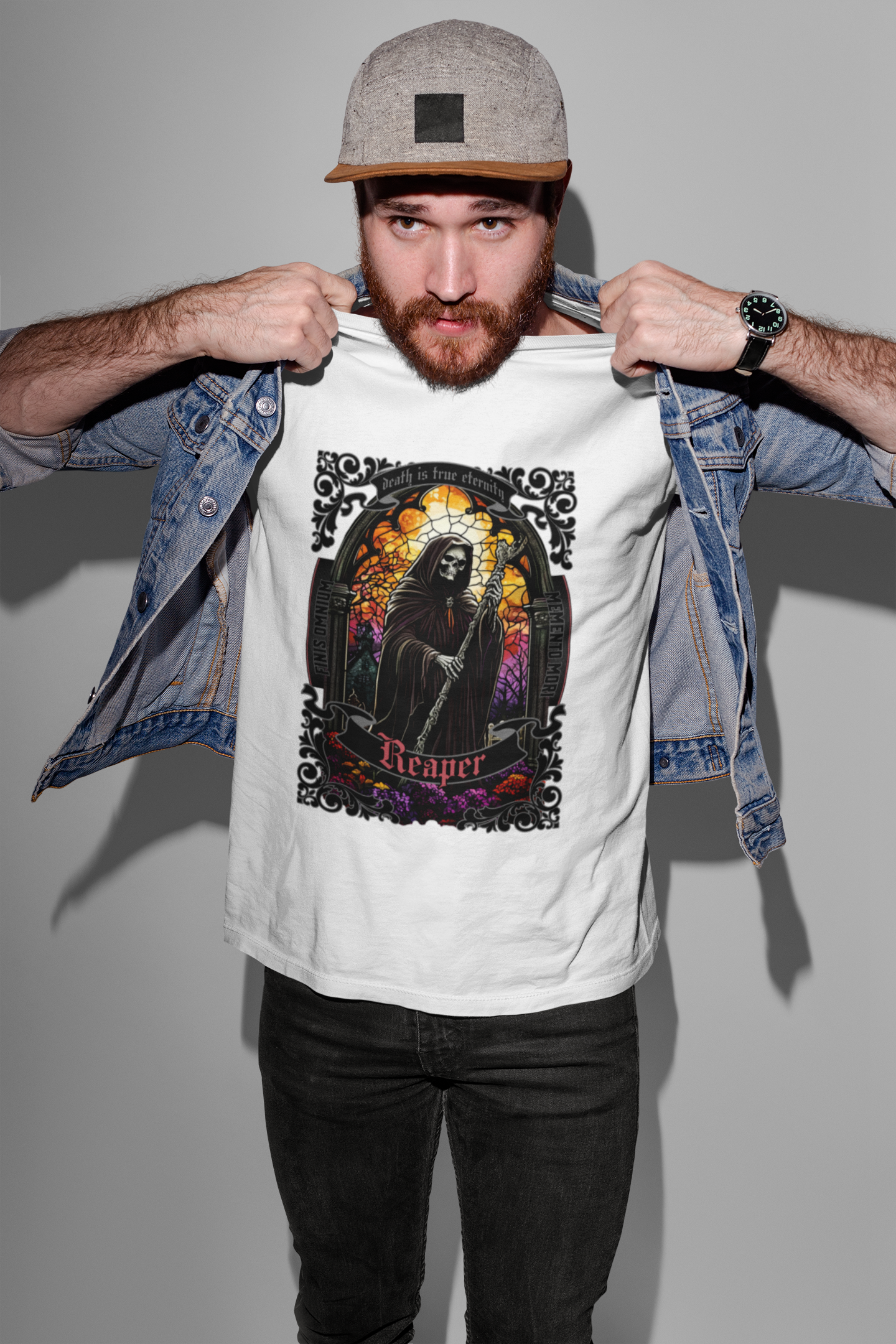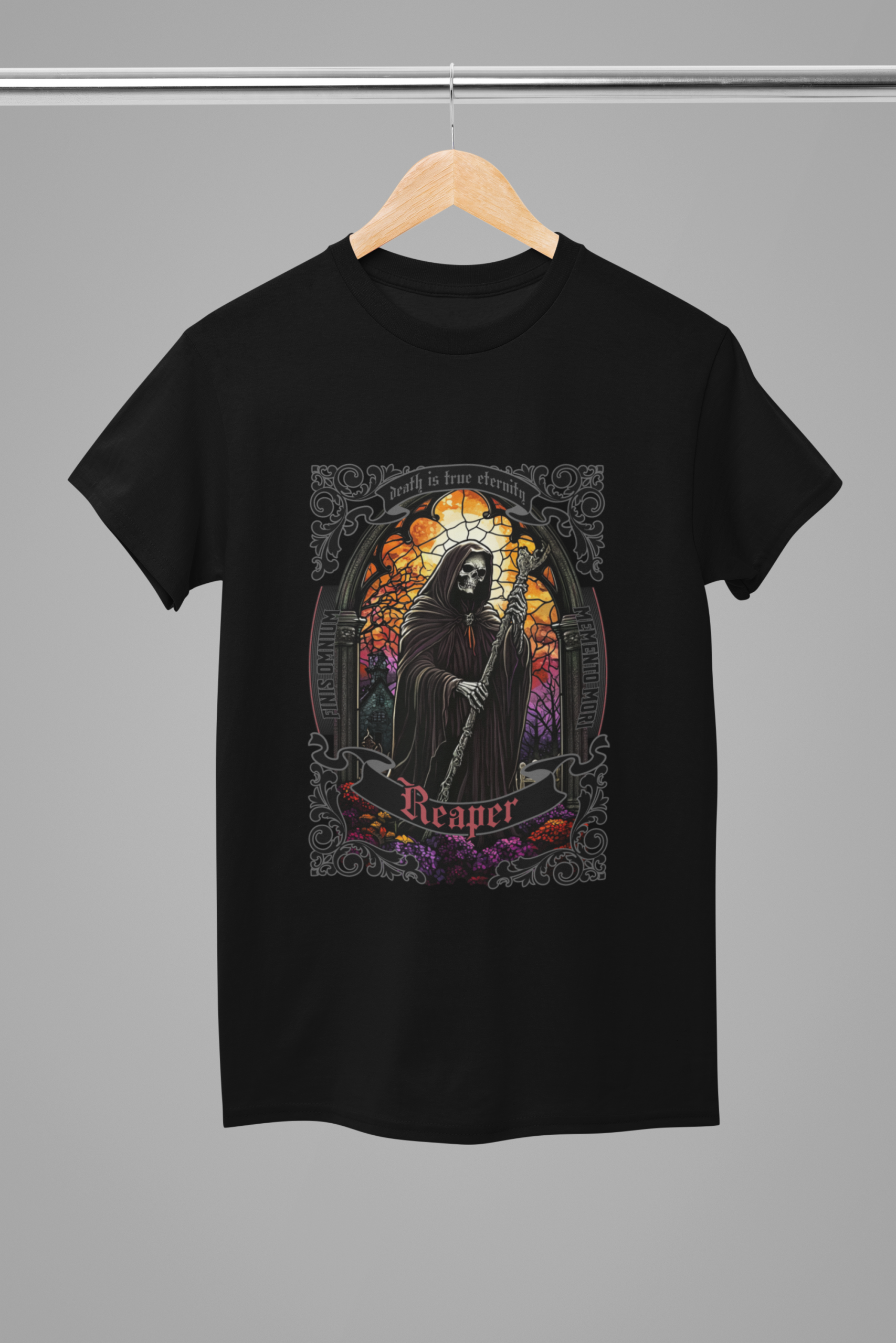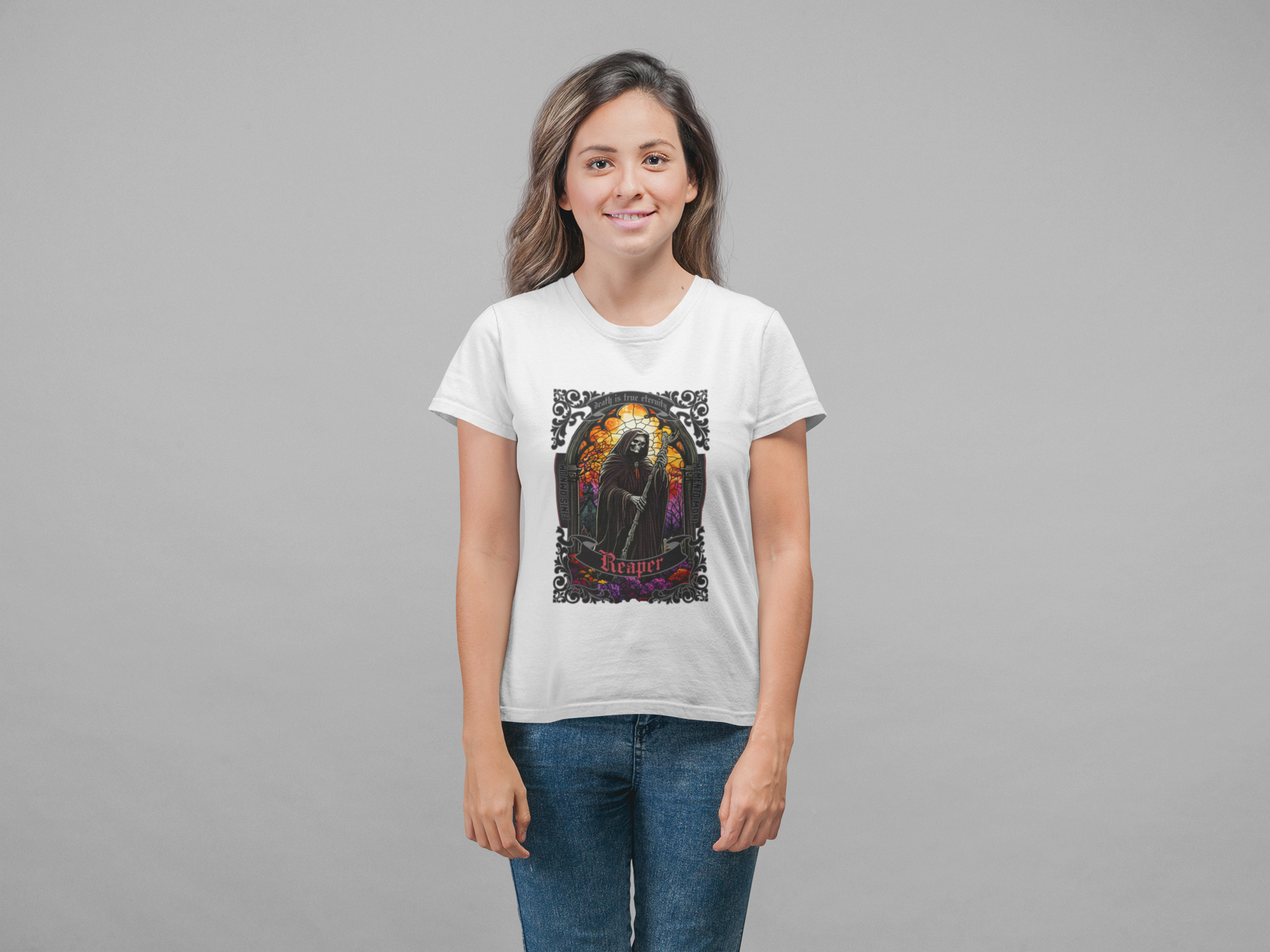 Saintly frame. Sinister grin. A cathedral-style stained-glass window wraps the Reaper in gothic filigree, sunset glow, and crisp knockout blacks that stay razor-sharp on both black and white tees.