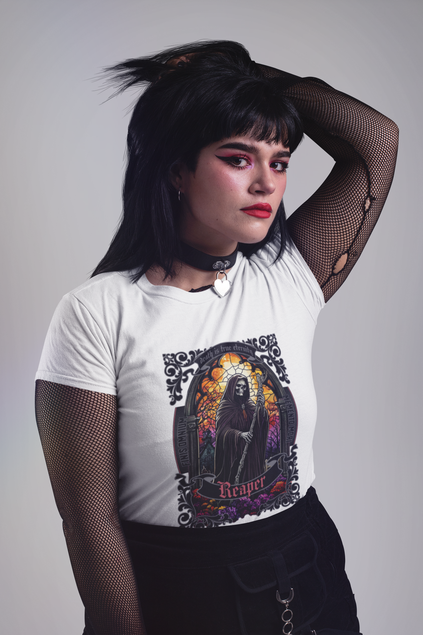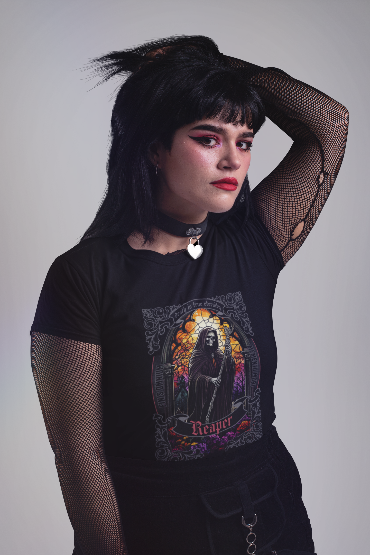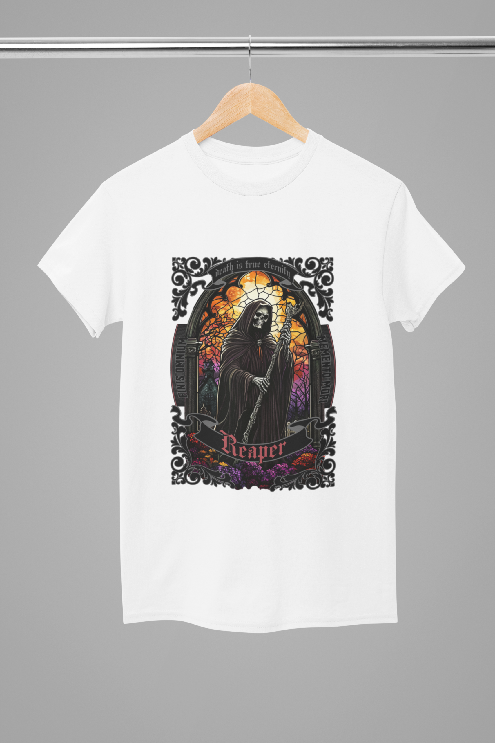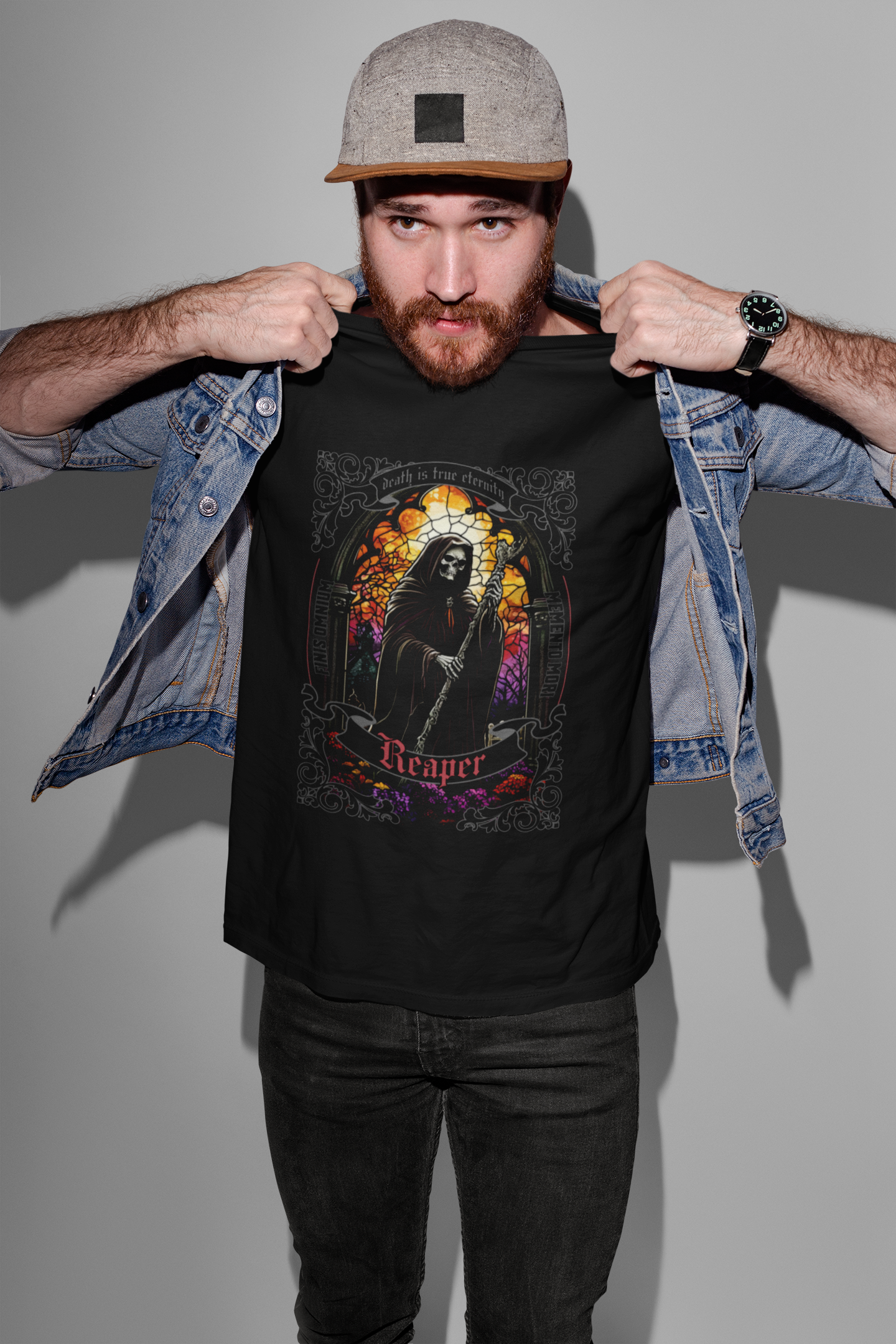 Saintly frame. Sinister grin. A cathedral-style stained-glass window wraps the Reaper in gothic filigree, sunset glow, and crisp knockout blacks that stay razor-sharp on both black and white tees.