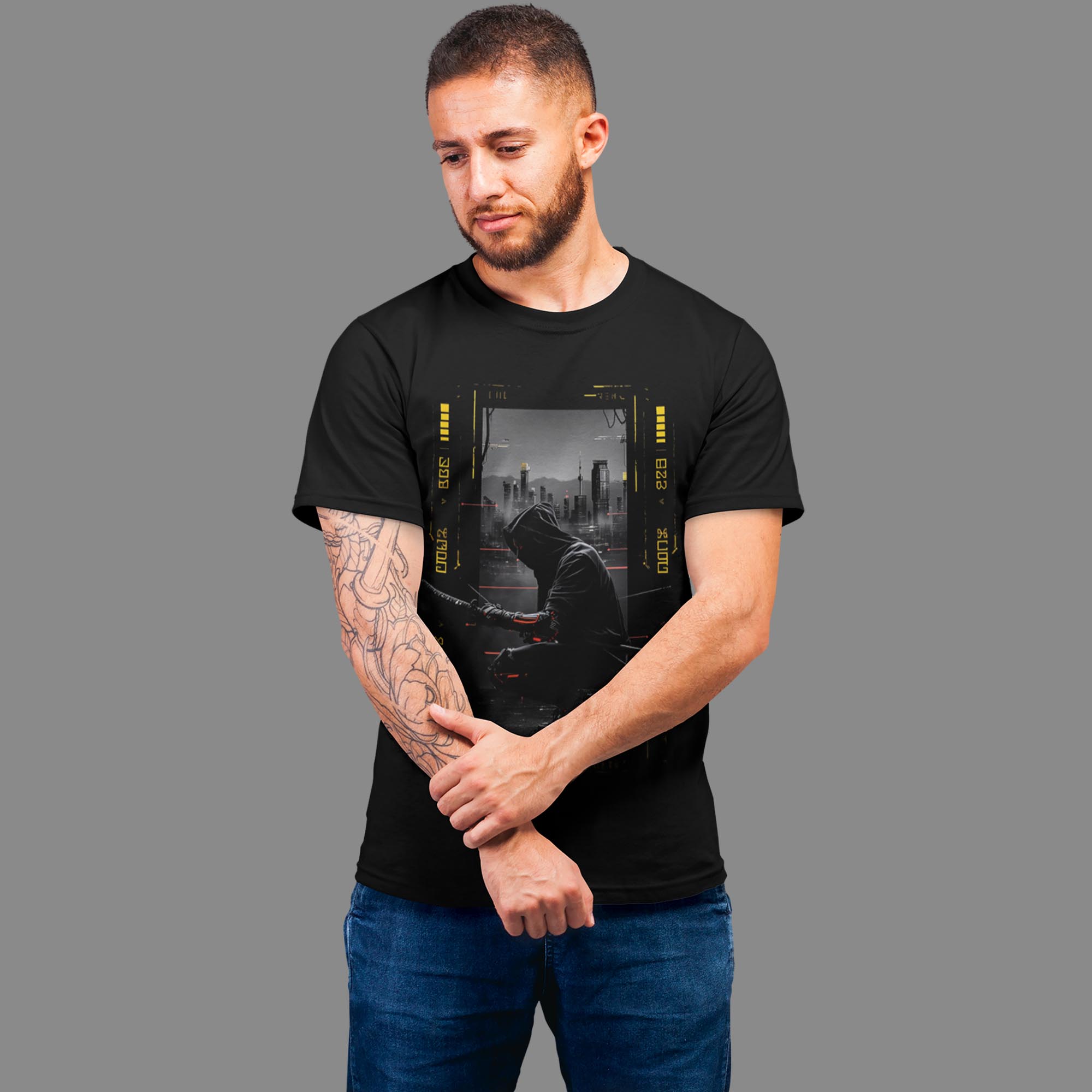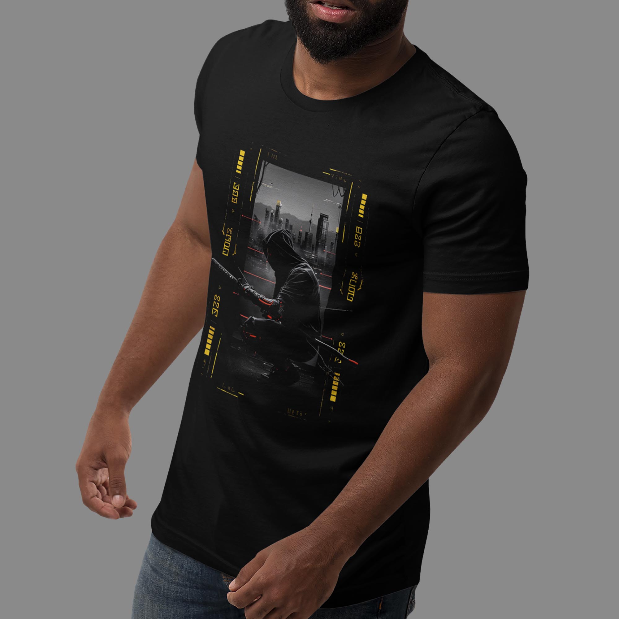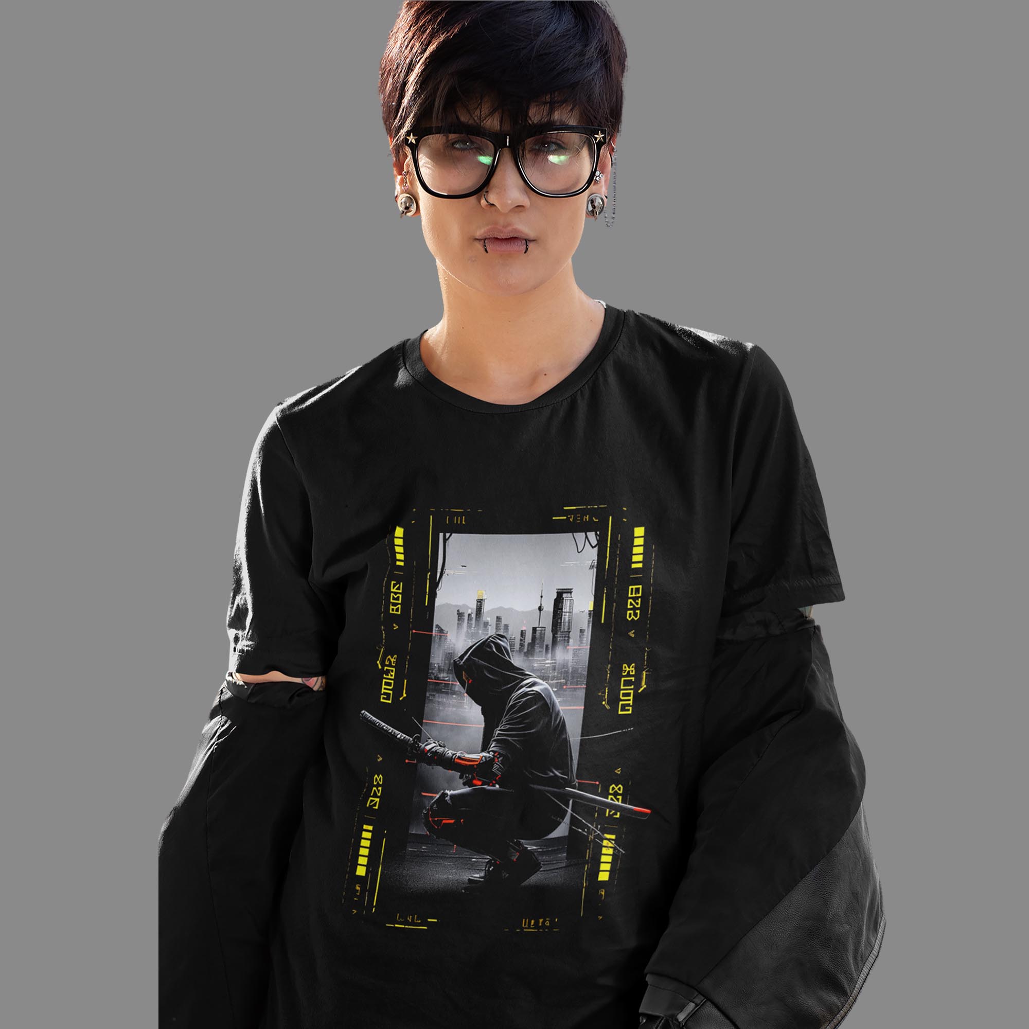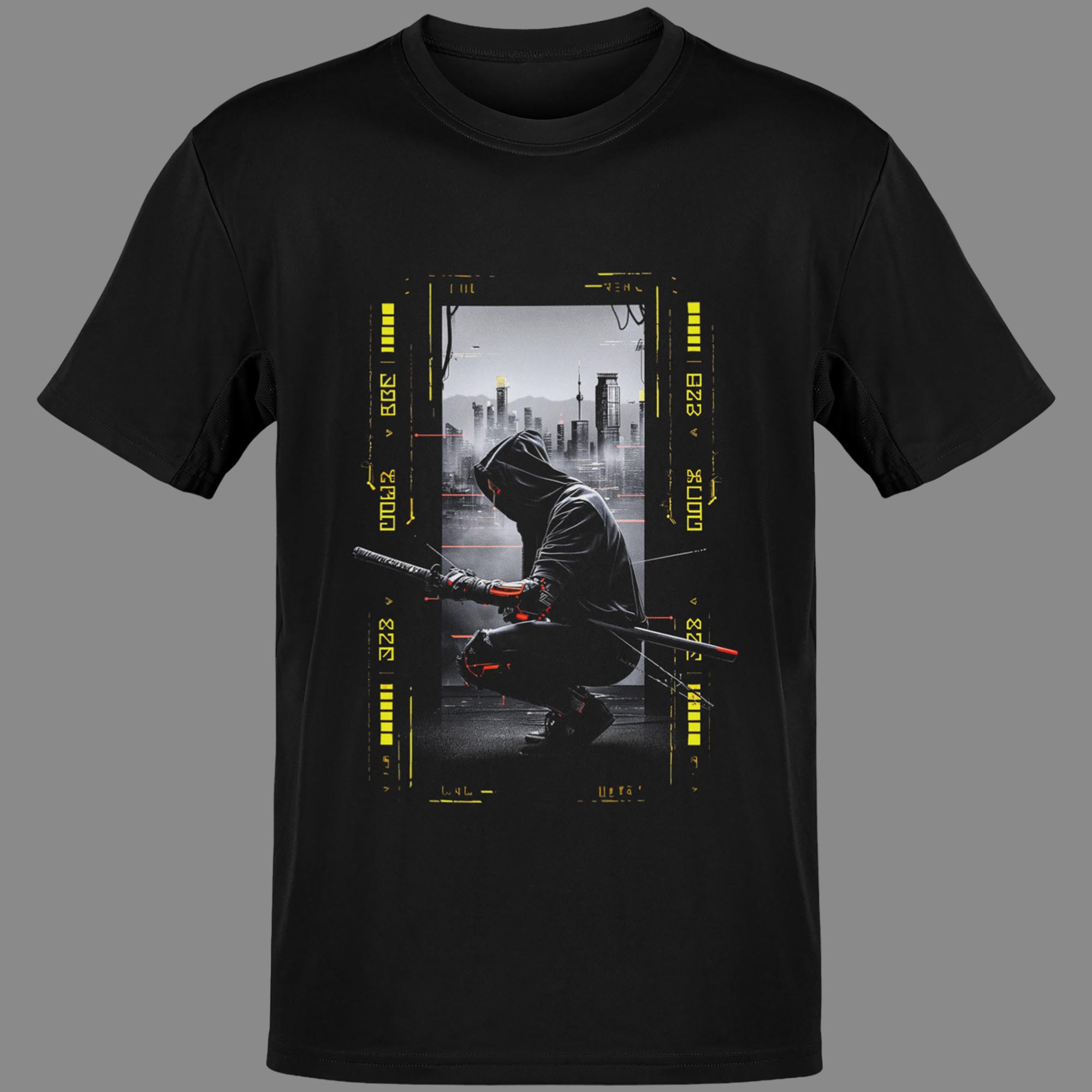 Shadow and neon collide in this cyberpunk ninja t-shirt. A hooded urban ninja kneels with katana drawn, framed by a sci-fi HUD and a distant city skyline.