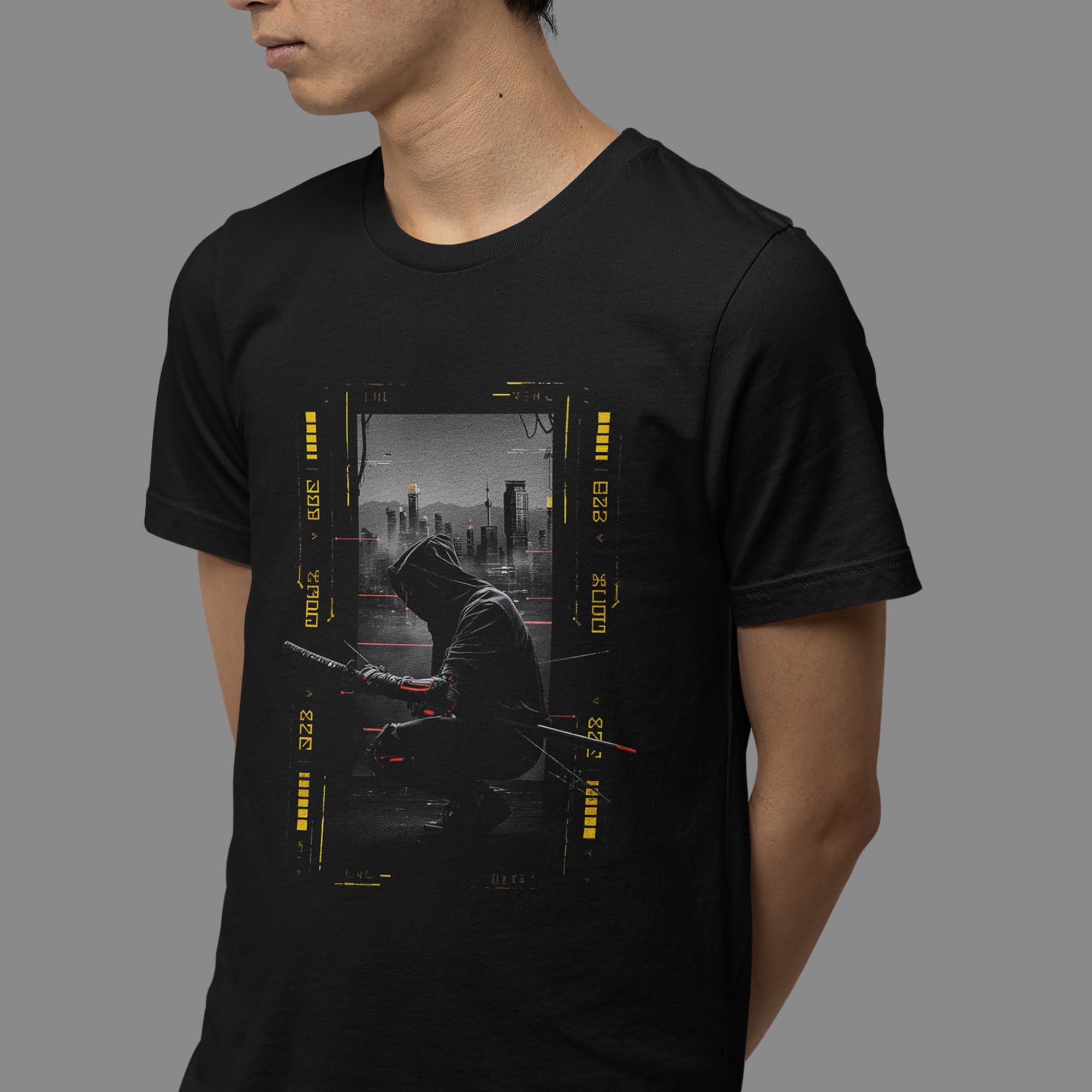 Because of the yellow UI accents and deep black base, this Japanese streetwear graphic hits hard without feeling busy. Meanwhile, the clean composition keeps the focus on the ninja, so the design stands out even across a room.
