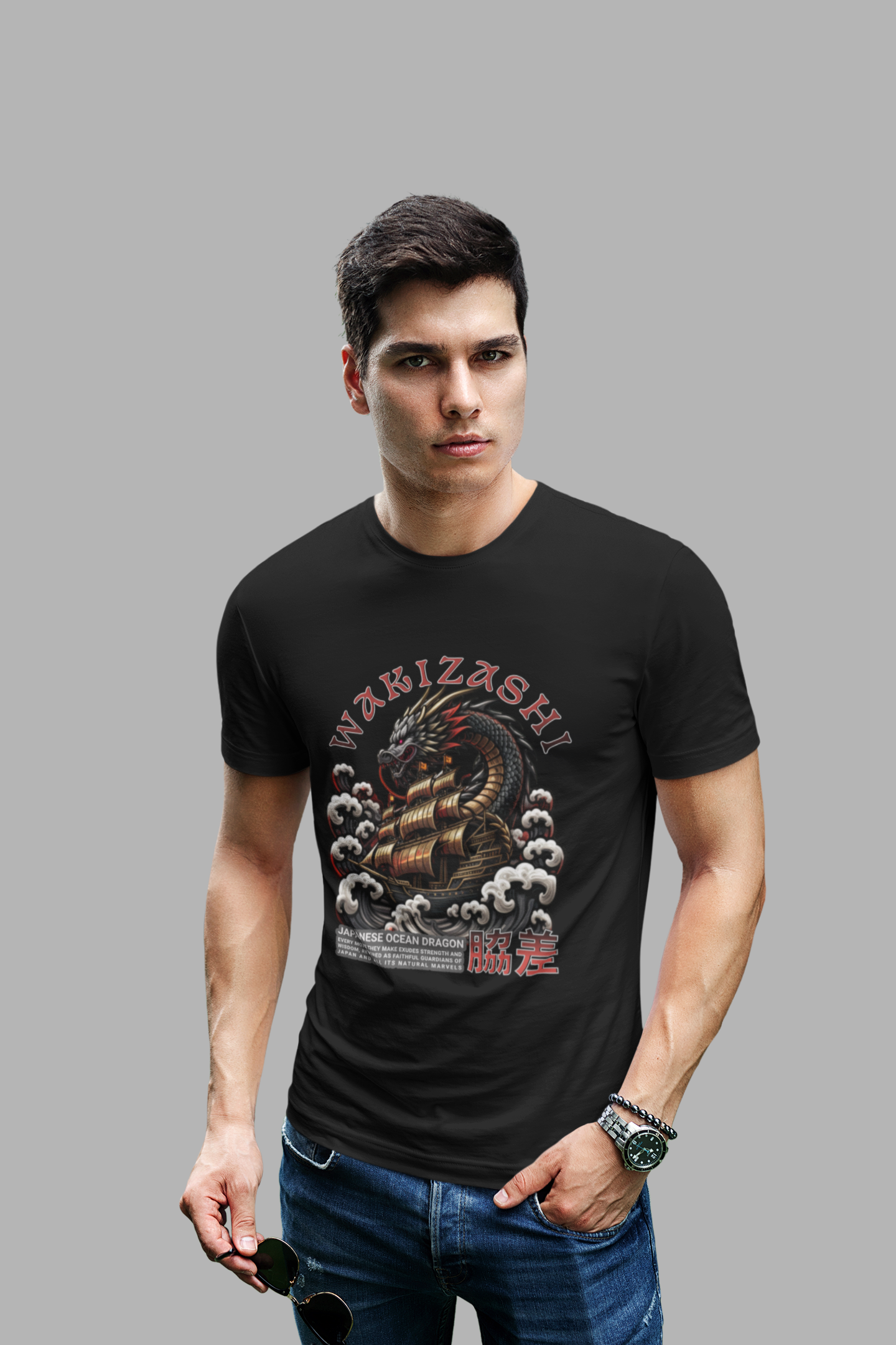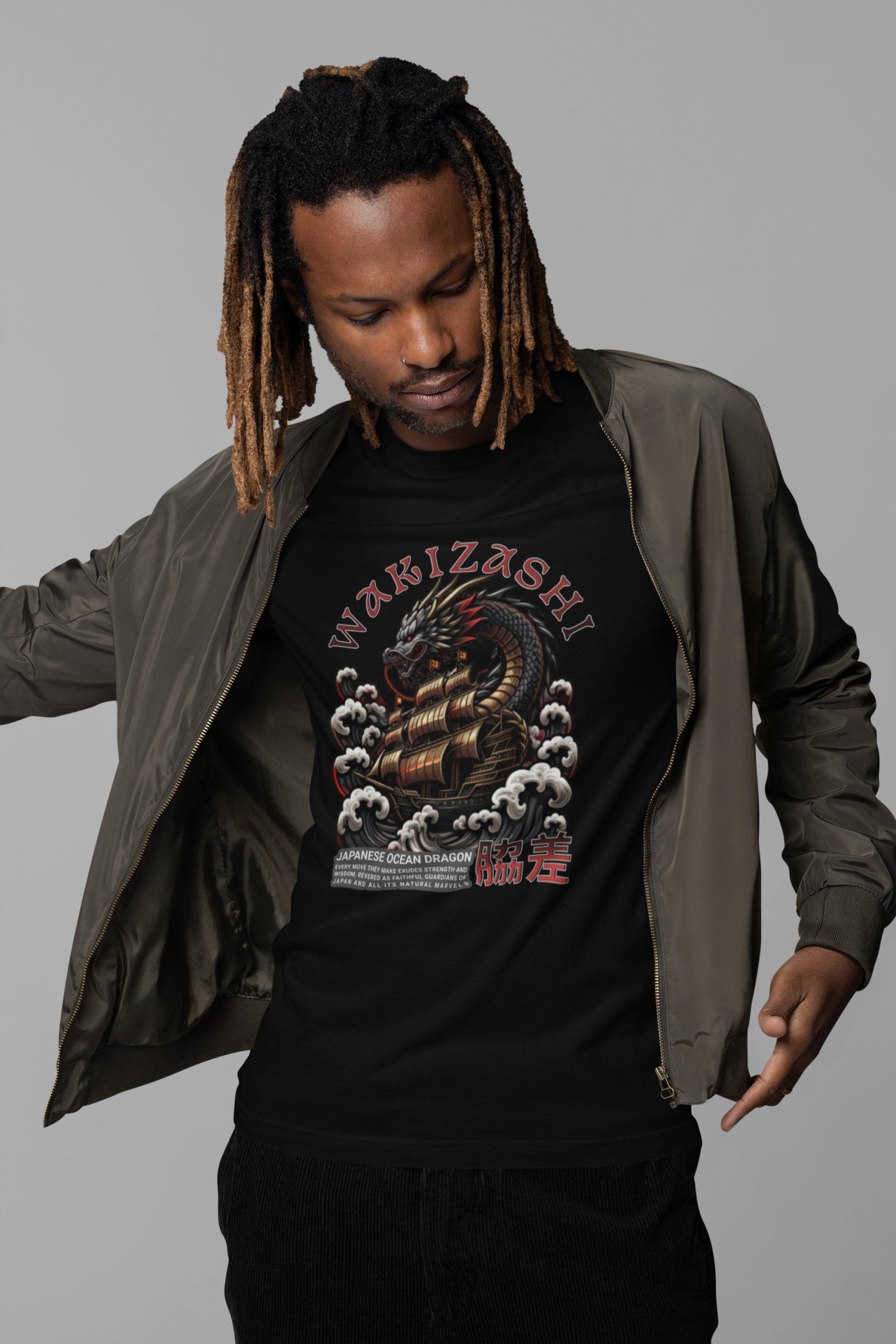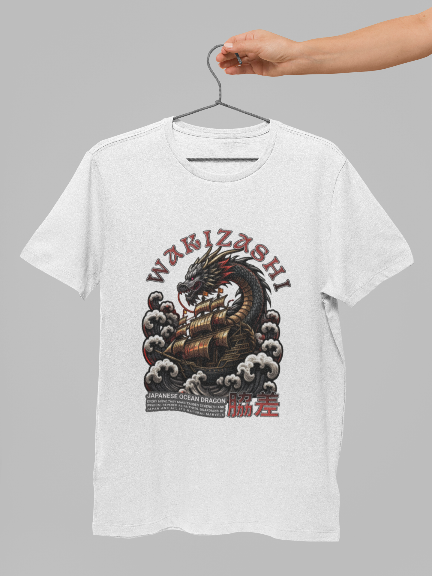Storm surge. Coiled steel. WAKIZASHI crashes across the chest—tattoo-style ocean dragon, cresting clouds, and bold type tuned for knockout contrast.