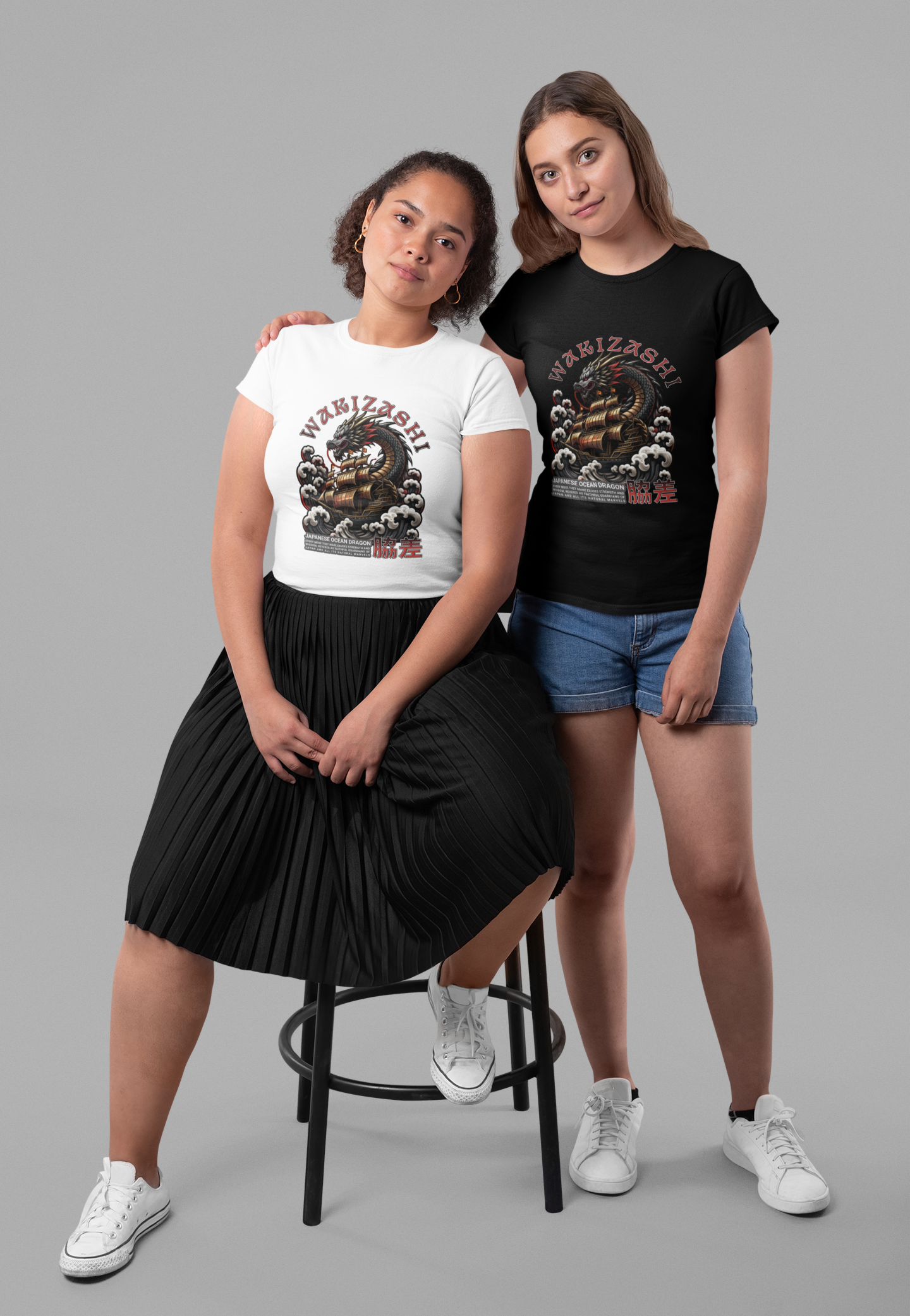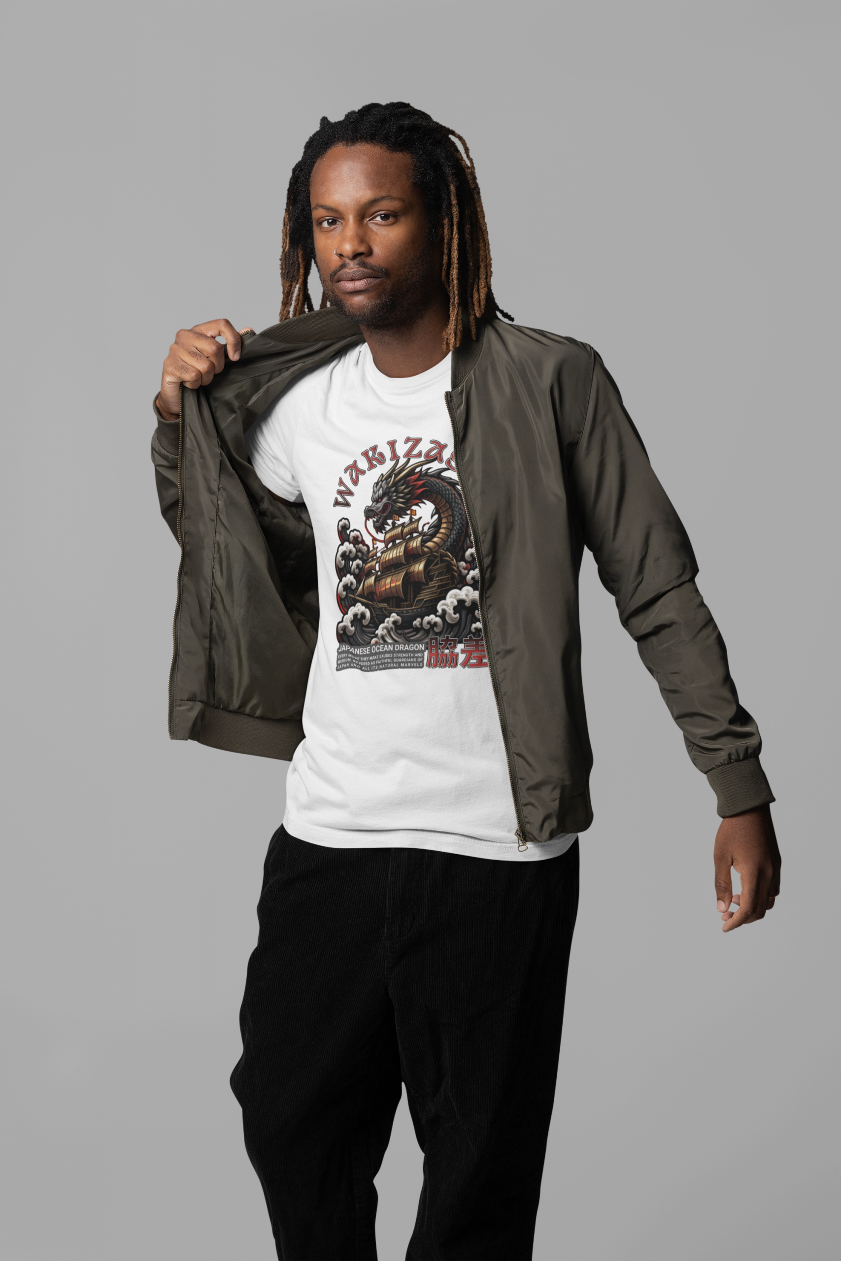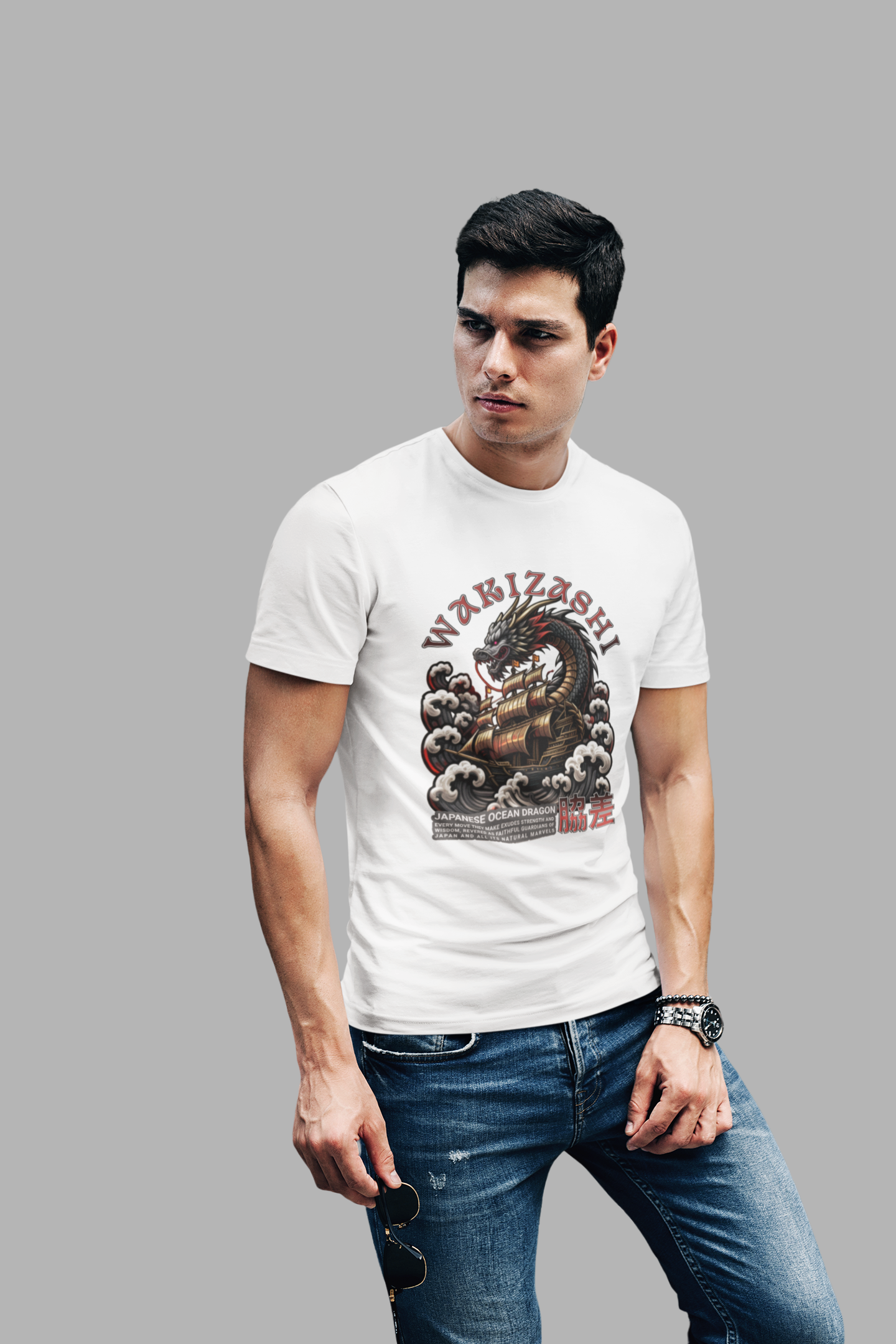 Storm surge. Coiled steel. WAKIZASHI crashes across the chest—tattoo-style ocean dragon, cresting clouds, and bold type tuned for knockout contrast.