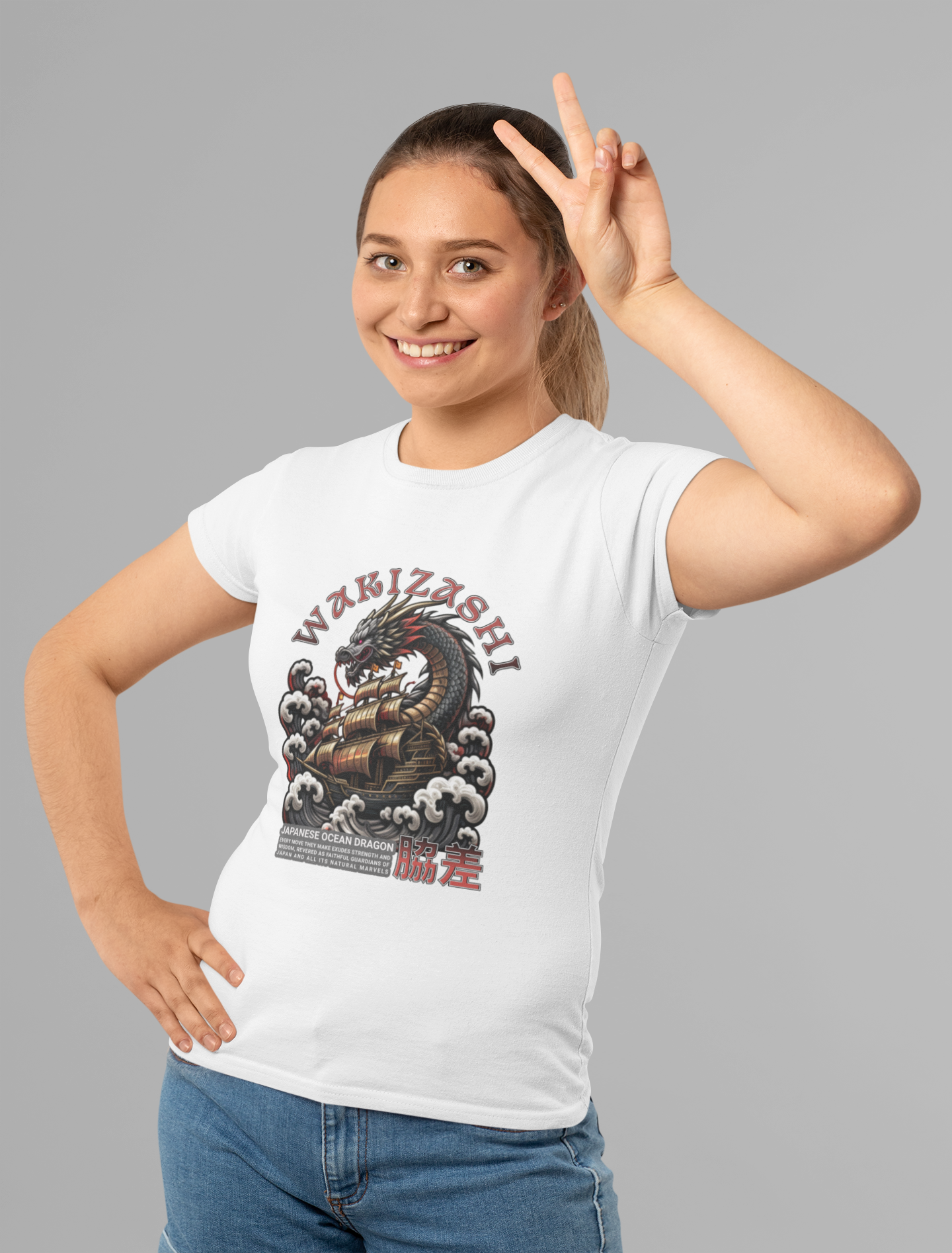 - Front graphic: Japanese ocean dragon wrapped around a sailing ship with arched “WAKIZASHI” and kanji block